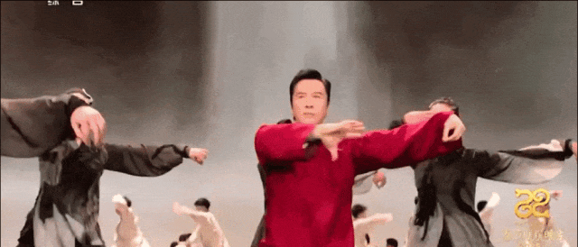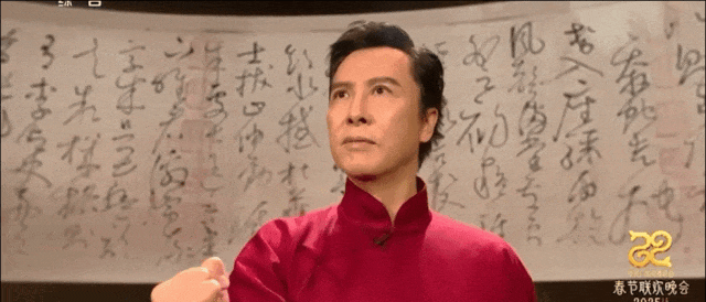 穿着红色唐装的甄子丹带着河南塔沟武校的小朋友们表演了《笔走龙蛇》,把武术、书法、诗词和吟唱四种文化结合在一起。